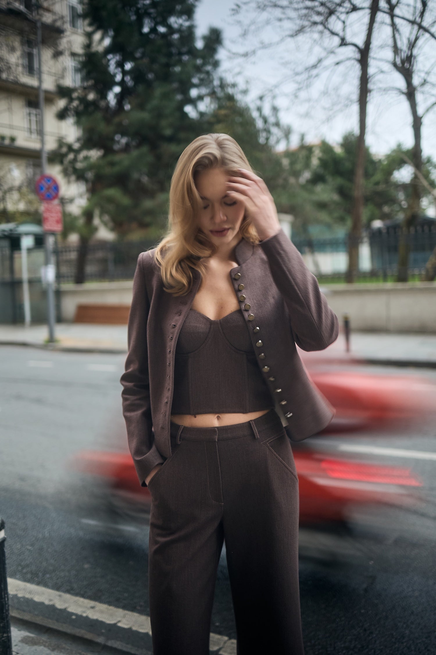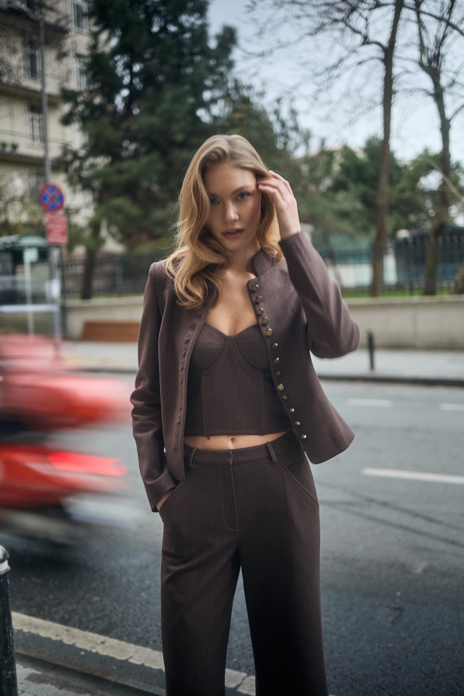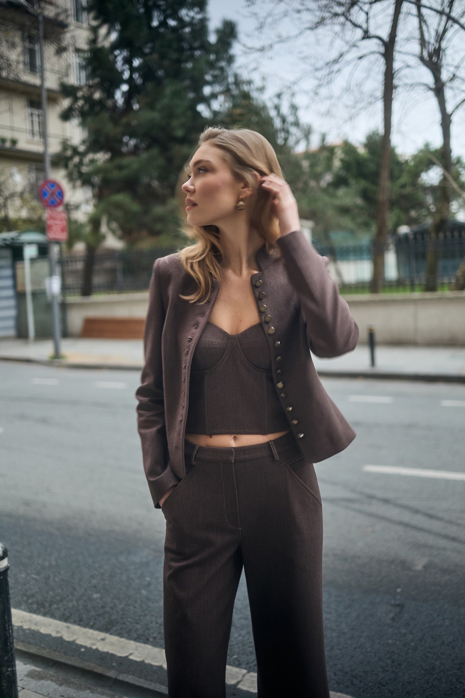 Ceket-Büstiyer-Pantolon Kahverengi Jean Takım