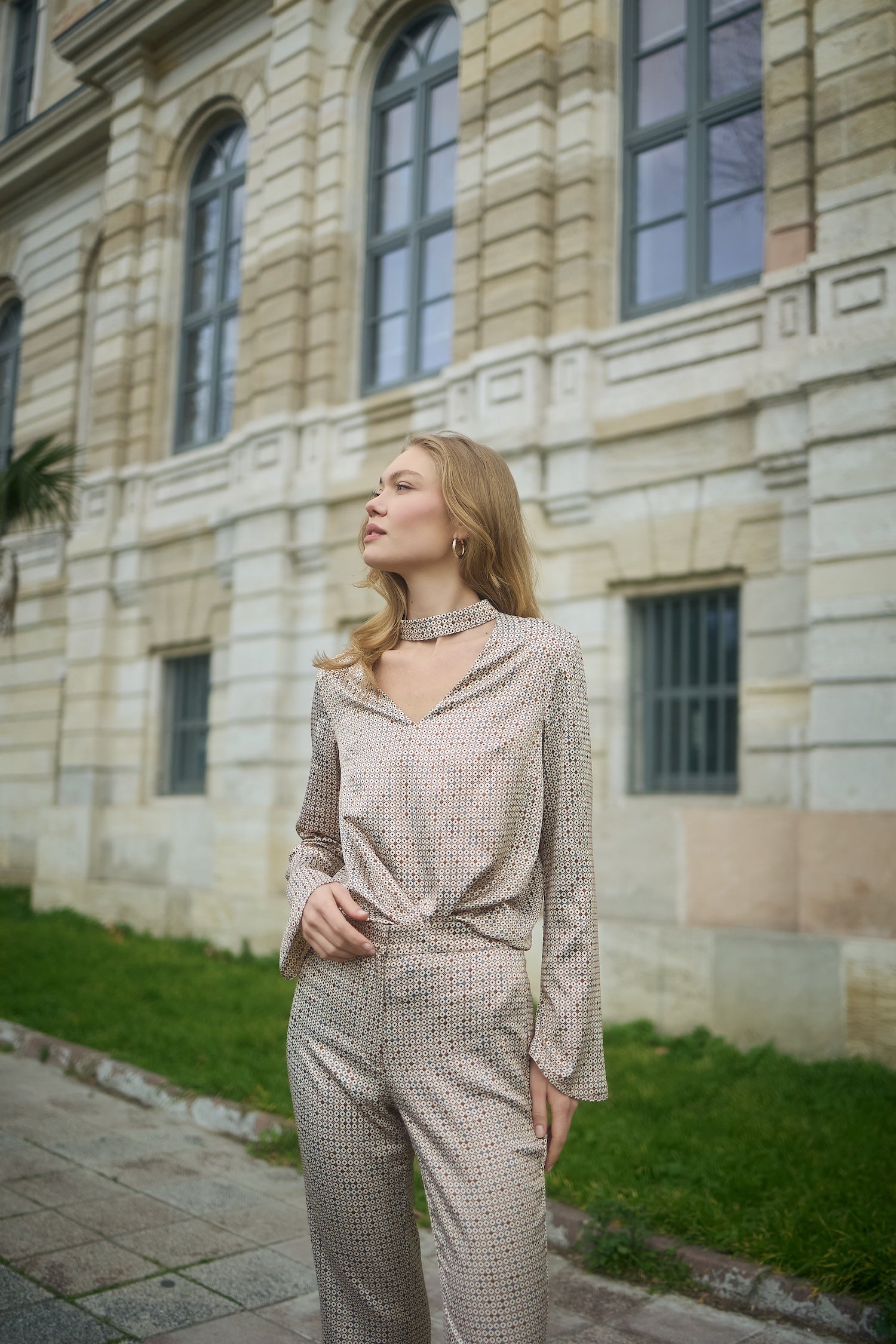 V Yaka Çok Renkli Bluz - Pantolon Takım