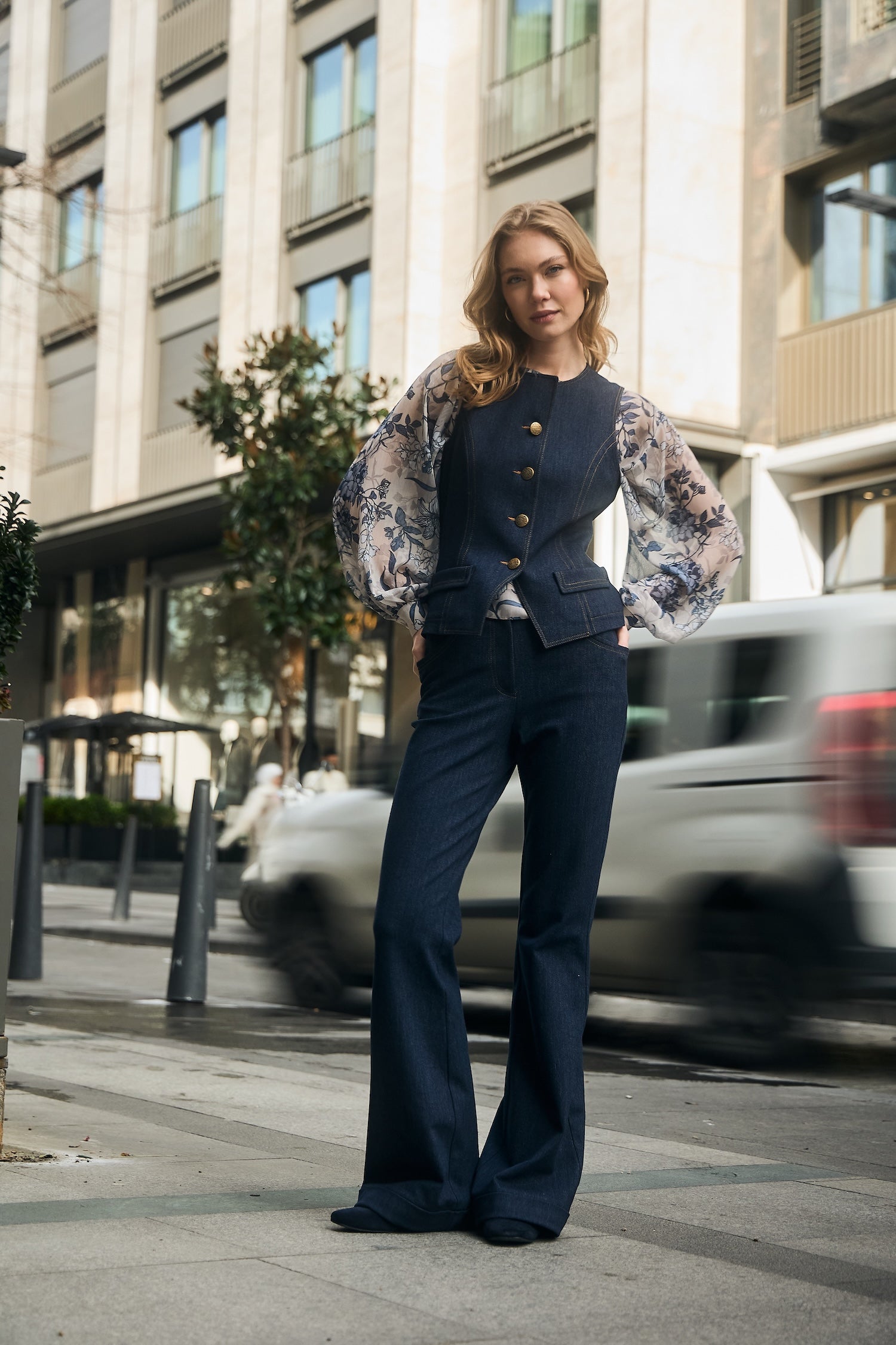 Aksesuarlı Dikiş Detaylı Düğmeli Likralı Jean Yelek - Pantolon Takım