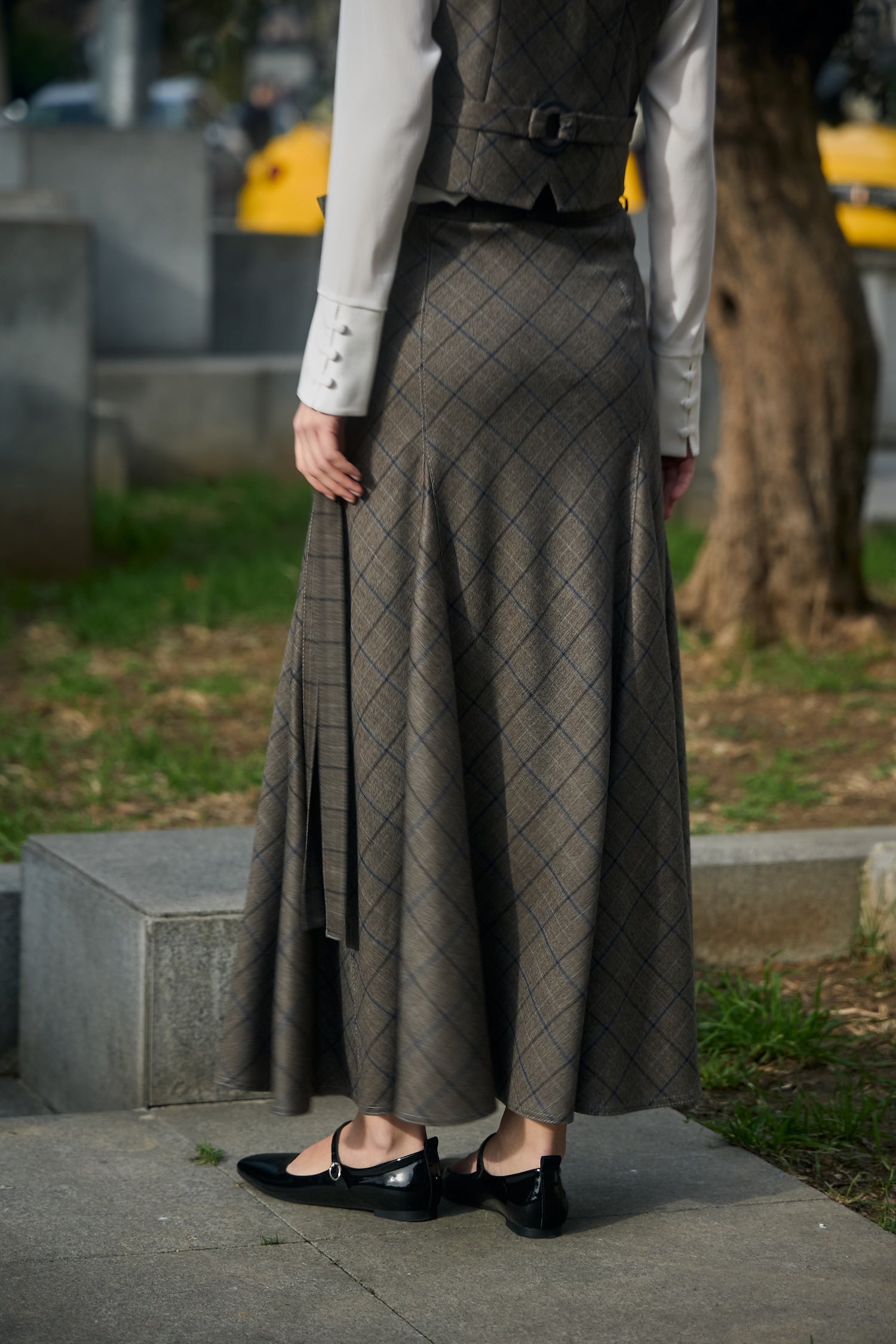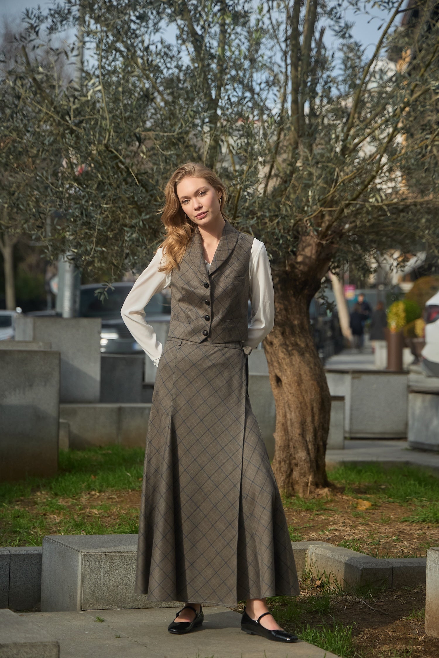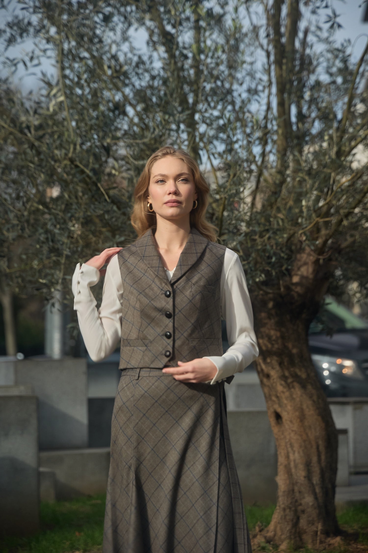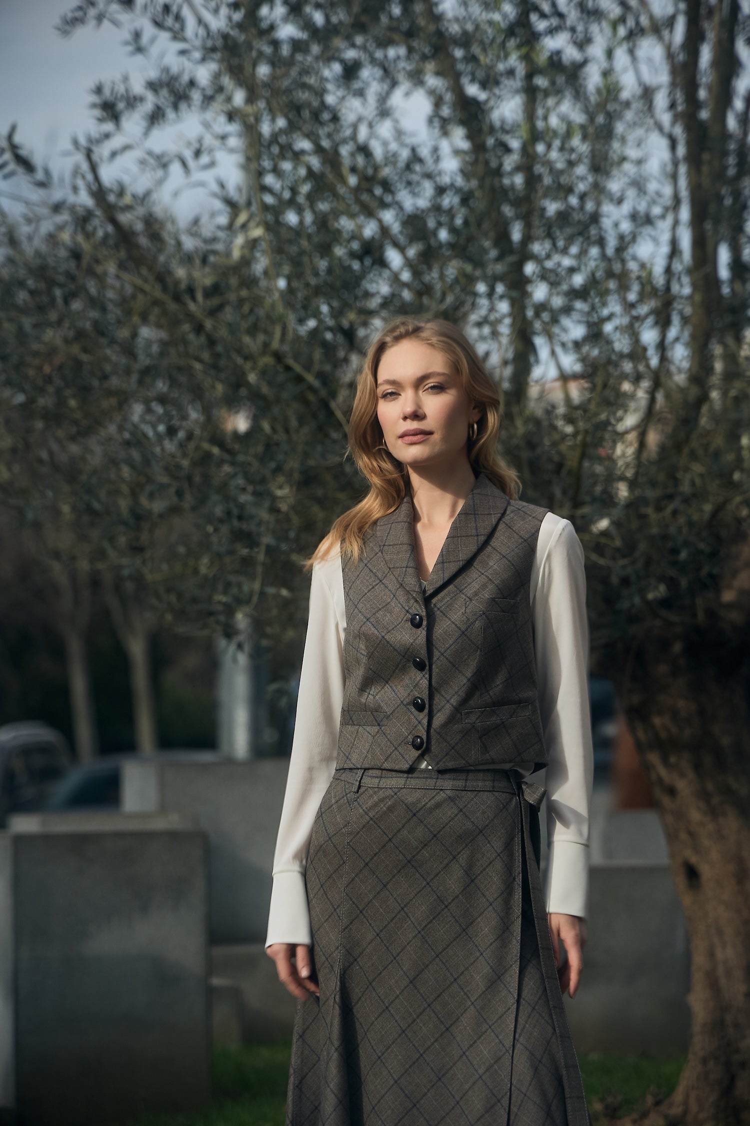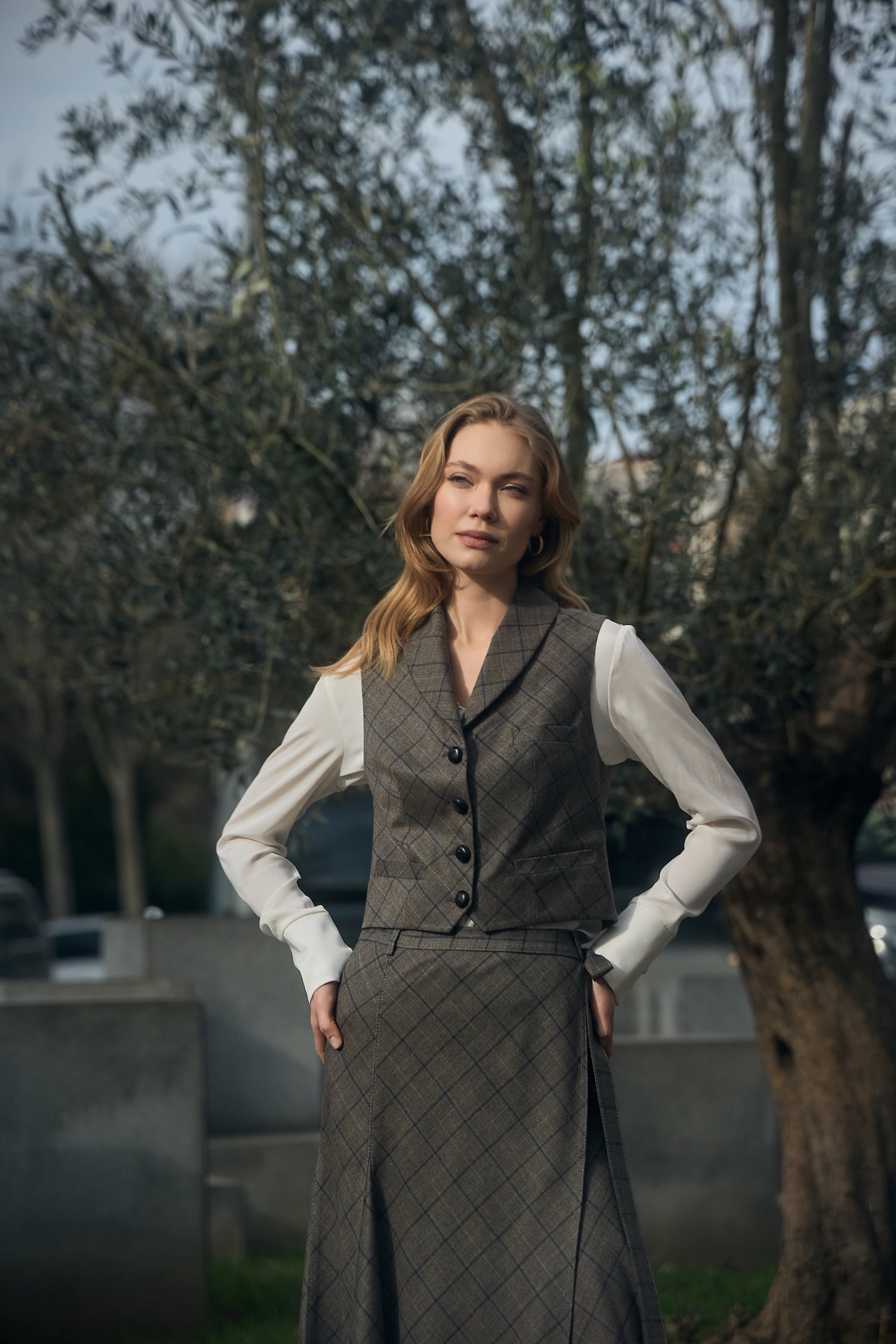 Deri Düğme Detaylı %100 Yün Ekose Yelek - Bel Bağlama Detaylı Etek Takım