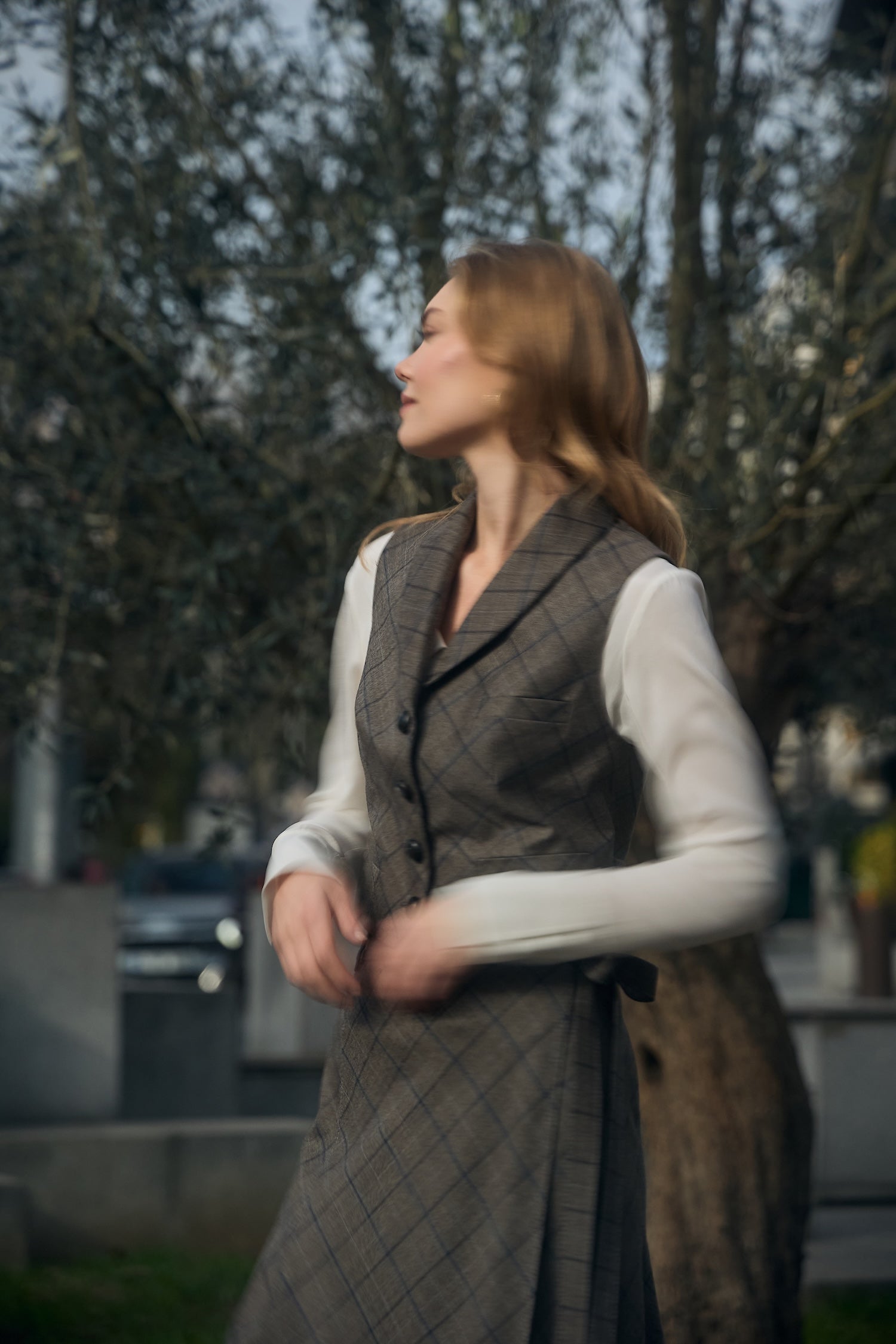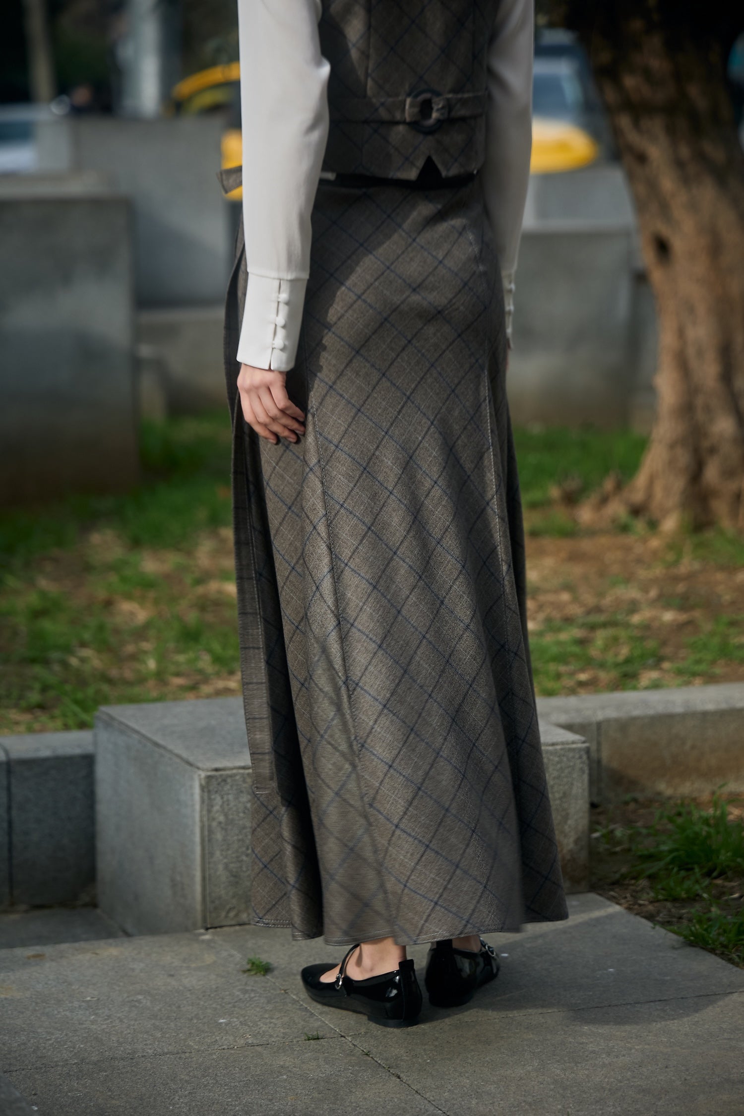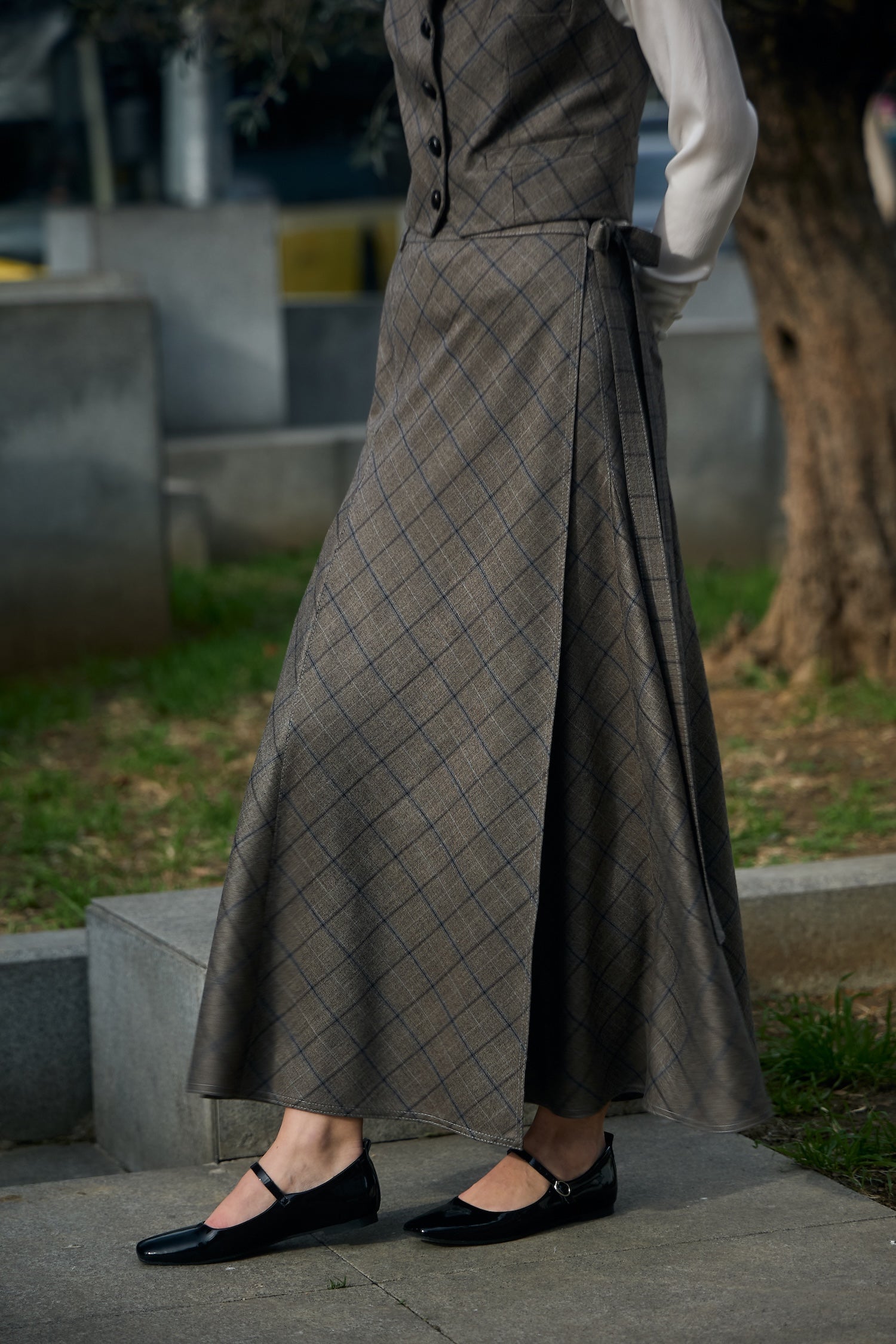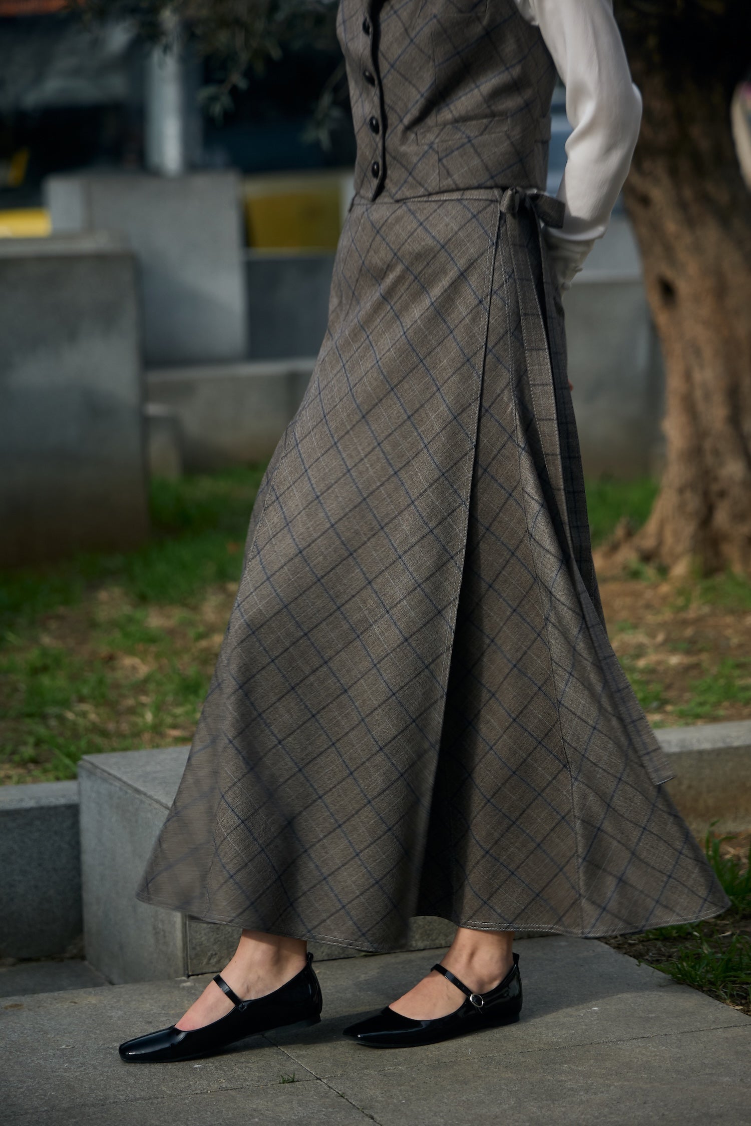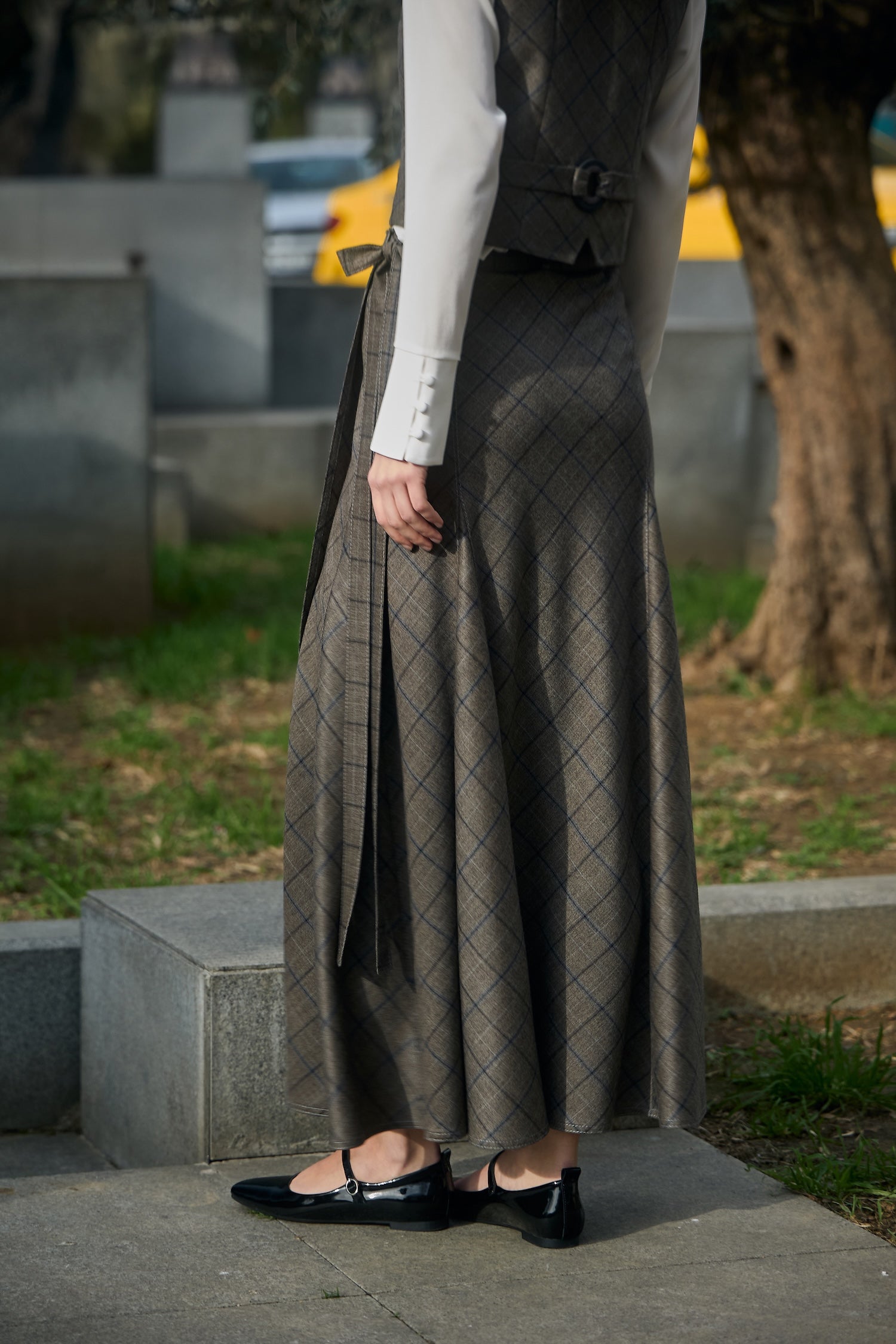 Deri Düğme Detaylı %100 Yün Ekose Yelek - Bel Bağlama Detaylı Etek Takım
