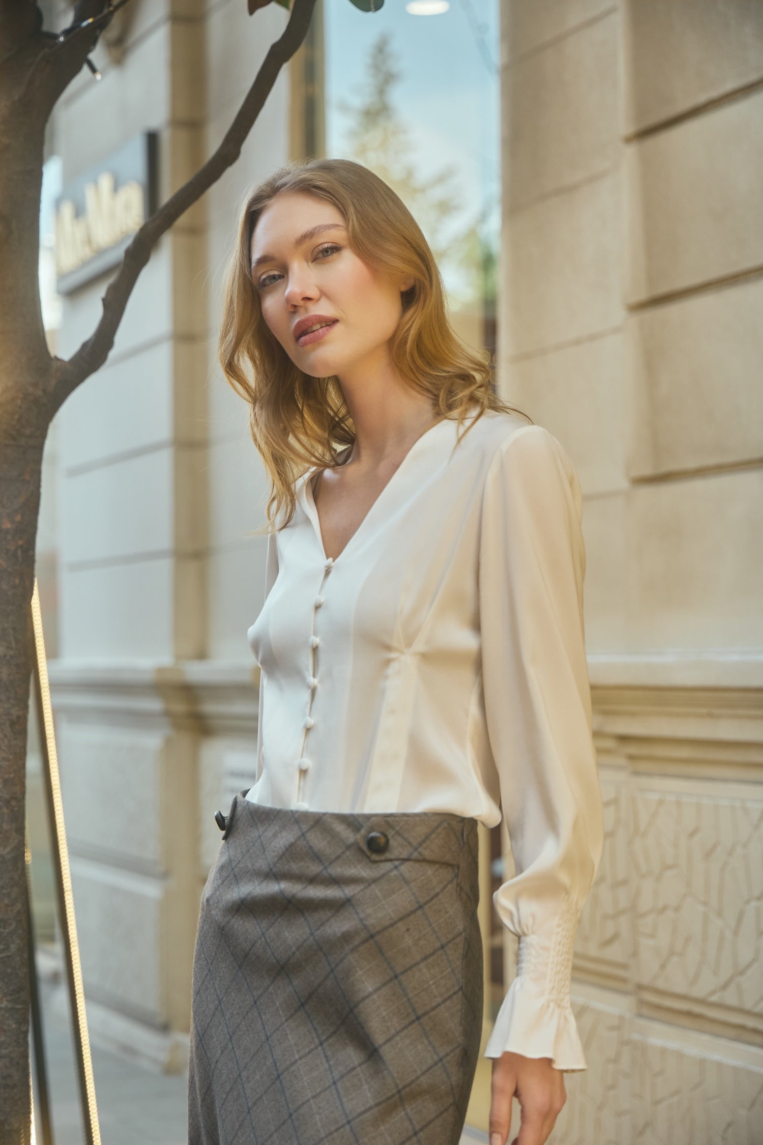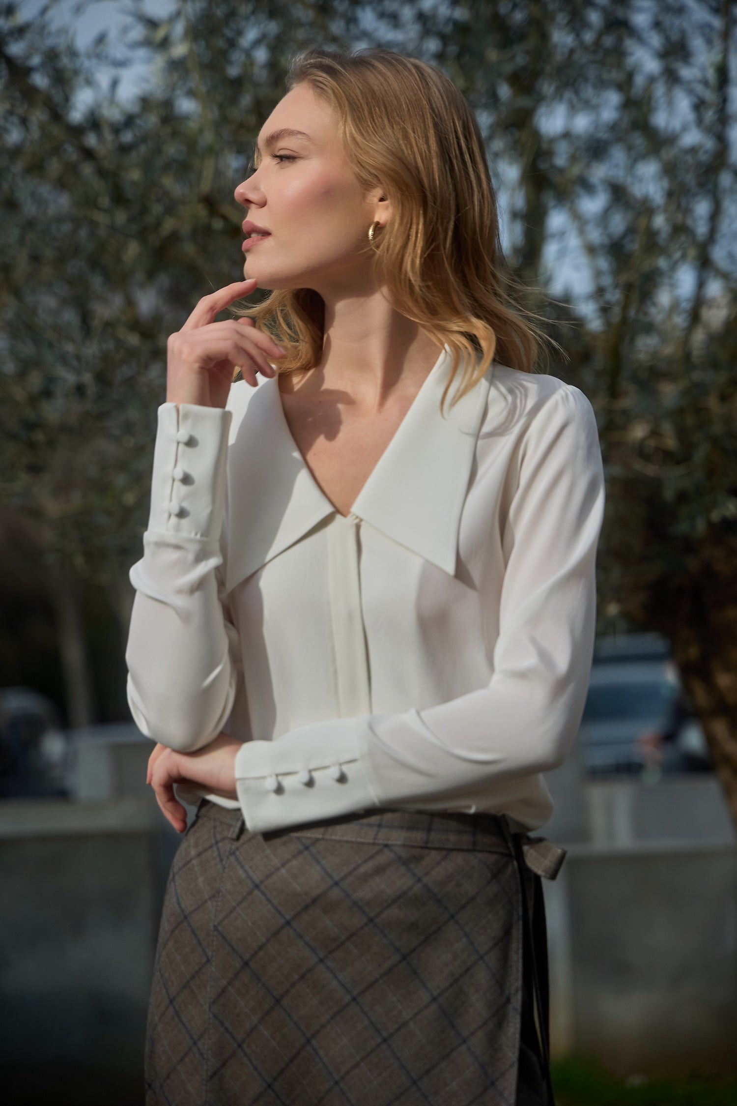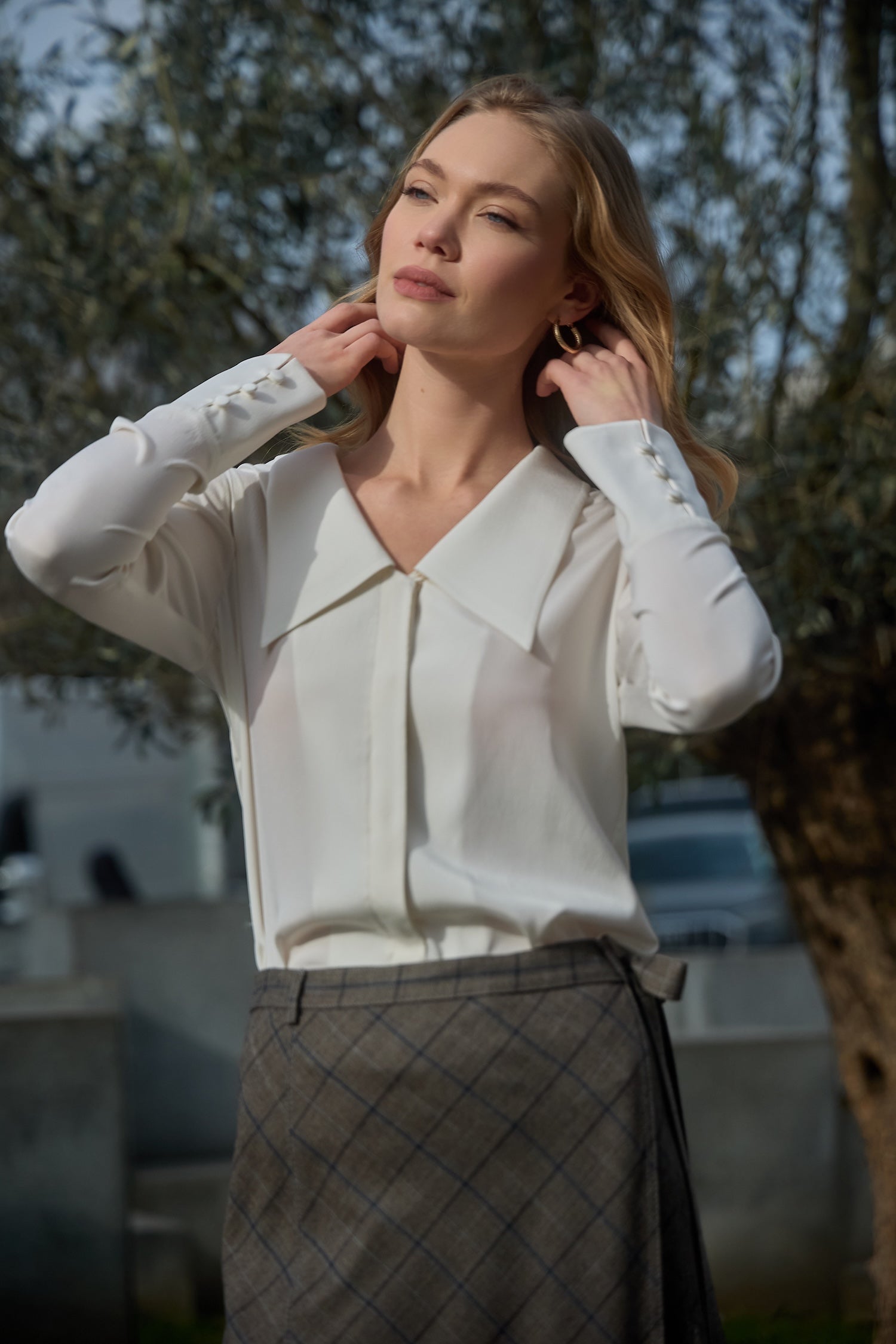Yaka Detaylı Düğmeli Ekru İpek Gömlek