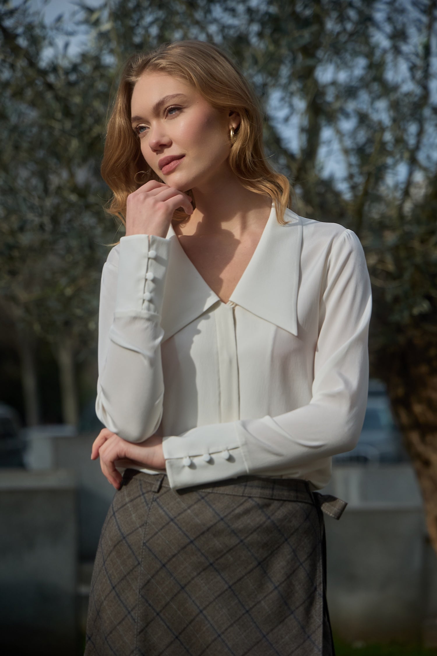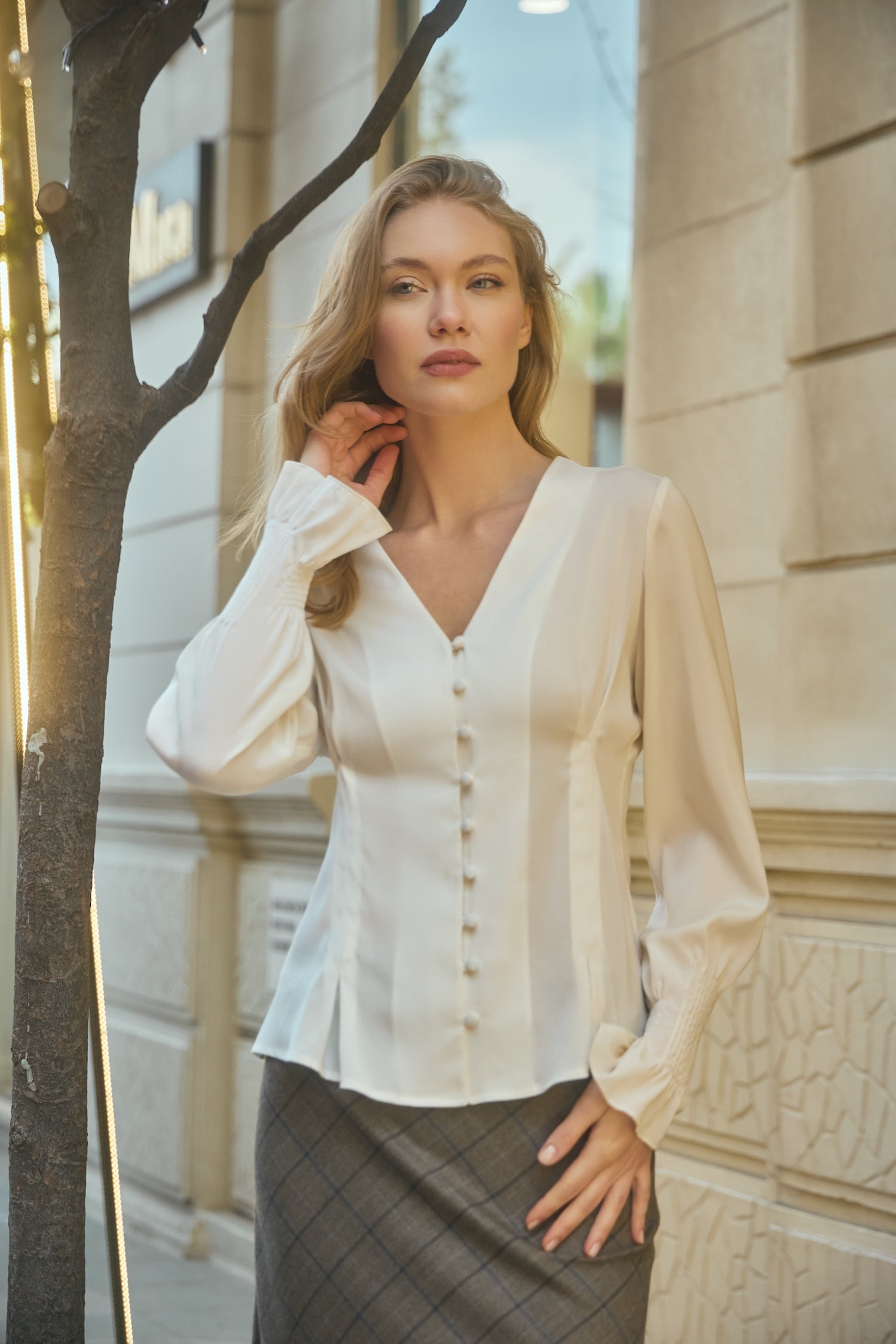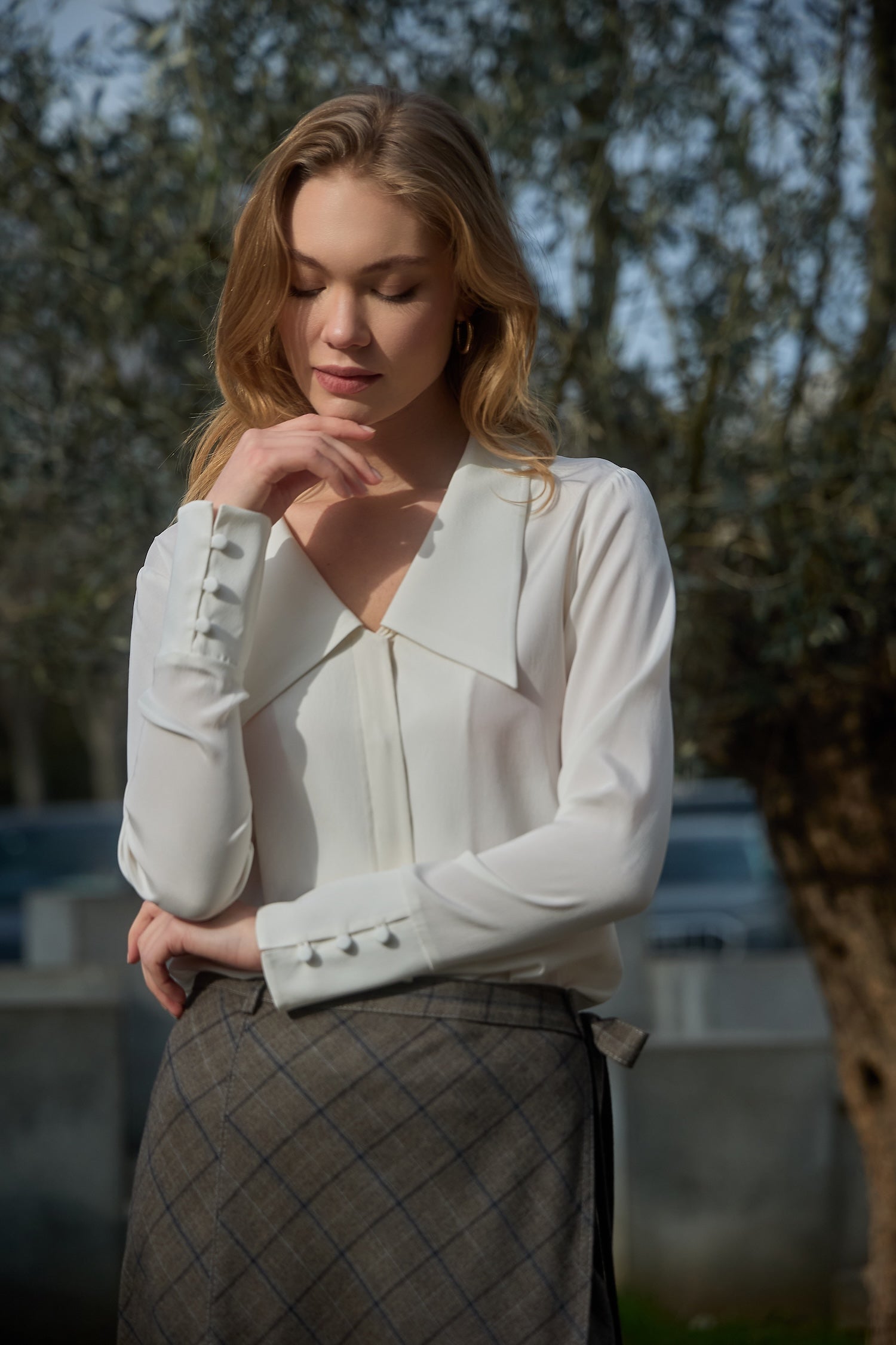 Yaka Detaylı Düğmeli Ekru İpek Gömlek