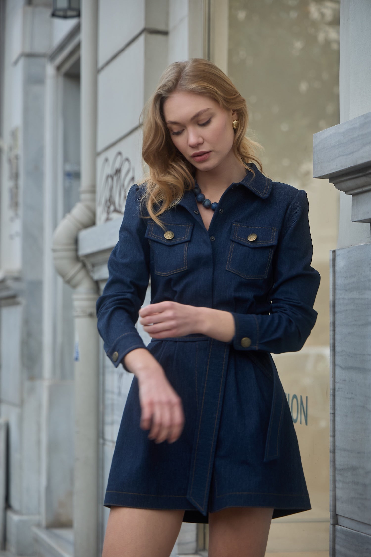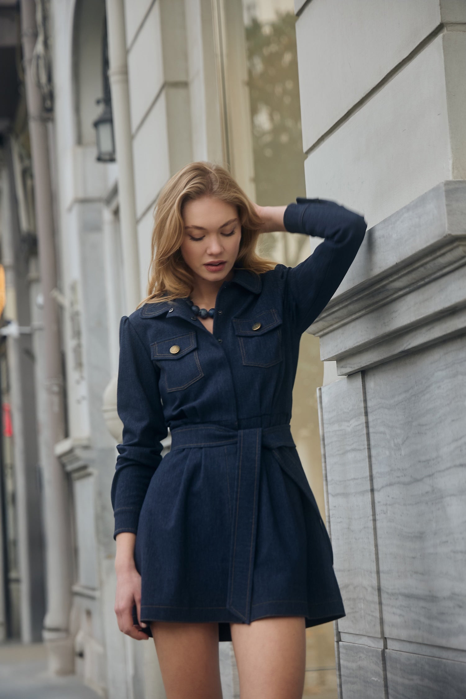 Hardal Rengi Dikiş Detaylı Lacivert Jean Elbise