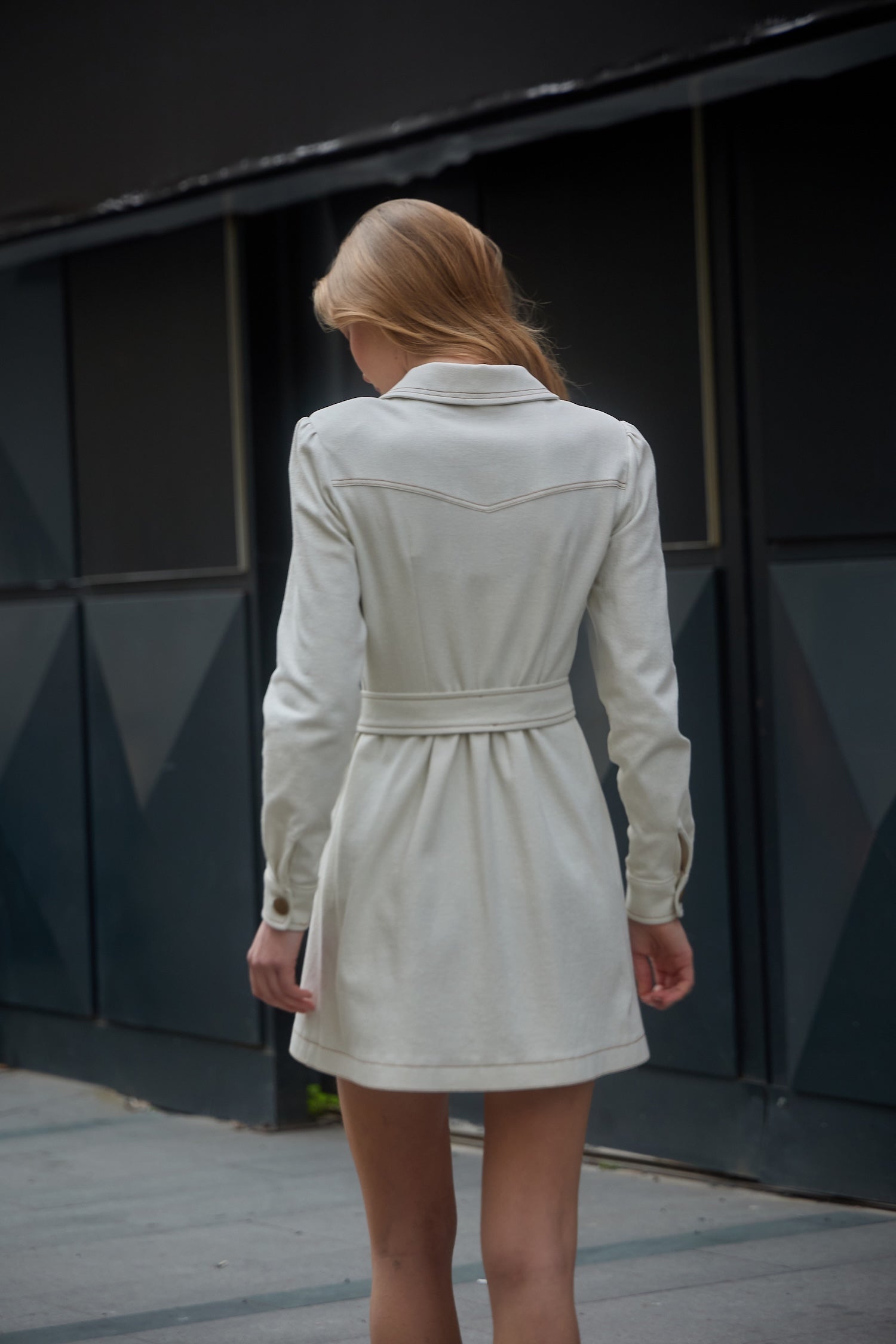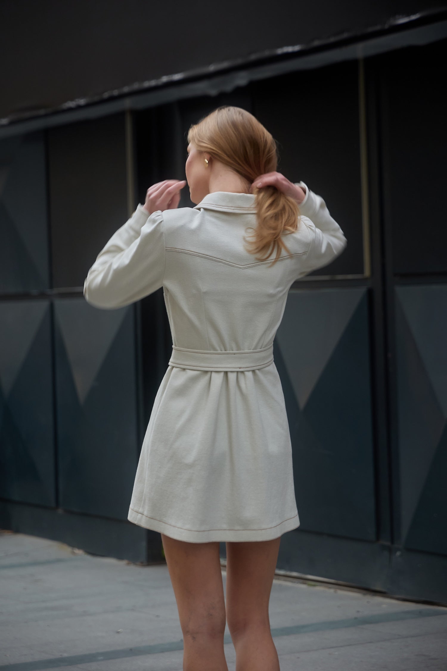 Hardal Rengi Dikiş Detaylı Ekru Jean Elbise