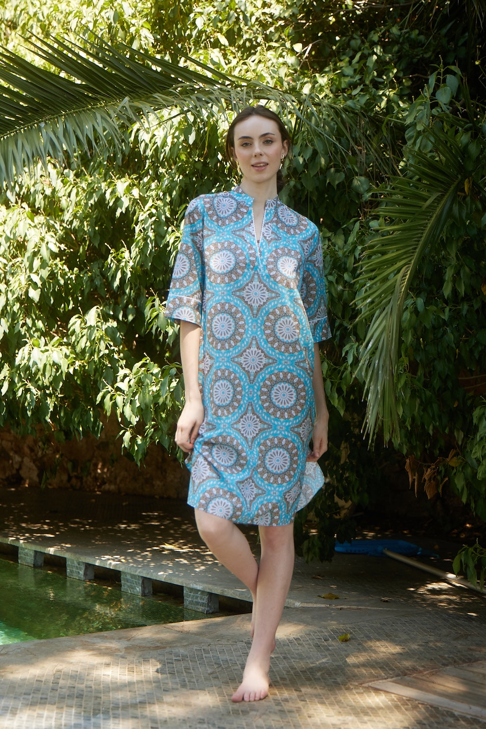Hakim Yaka Kısa Cotton Kaftan Turkuaz - Kahverengi